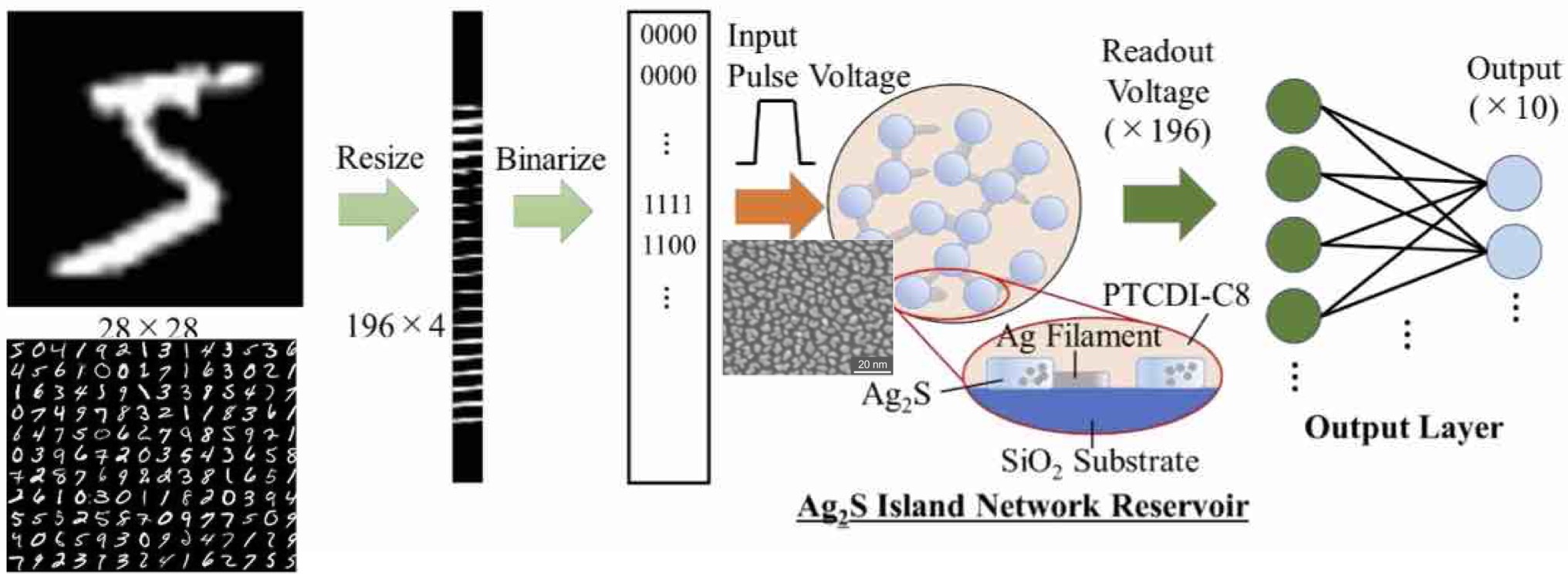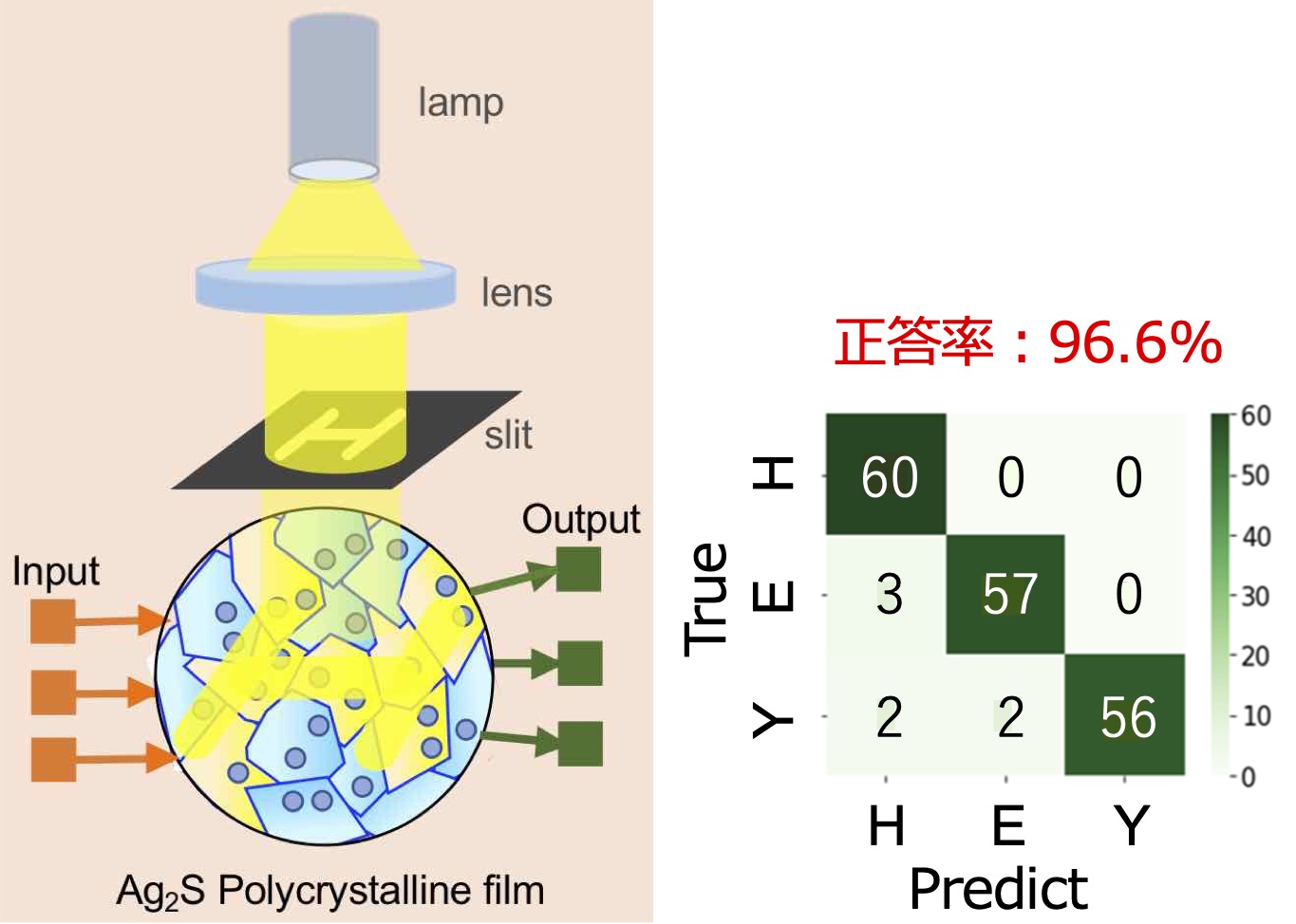 イオン移動を利用した物理リザバーを用いて、60,000文字の学習データと10,000文字のテストデータを用いて手書き文字の認識タスクを行いました。正答率は90%を超え、ソフトウエアで行った場合とほぼ同等の性能が得られました。Jpn. J. Appl. Phys. 62, SG1032 (2023)で発表。