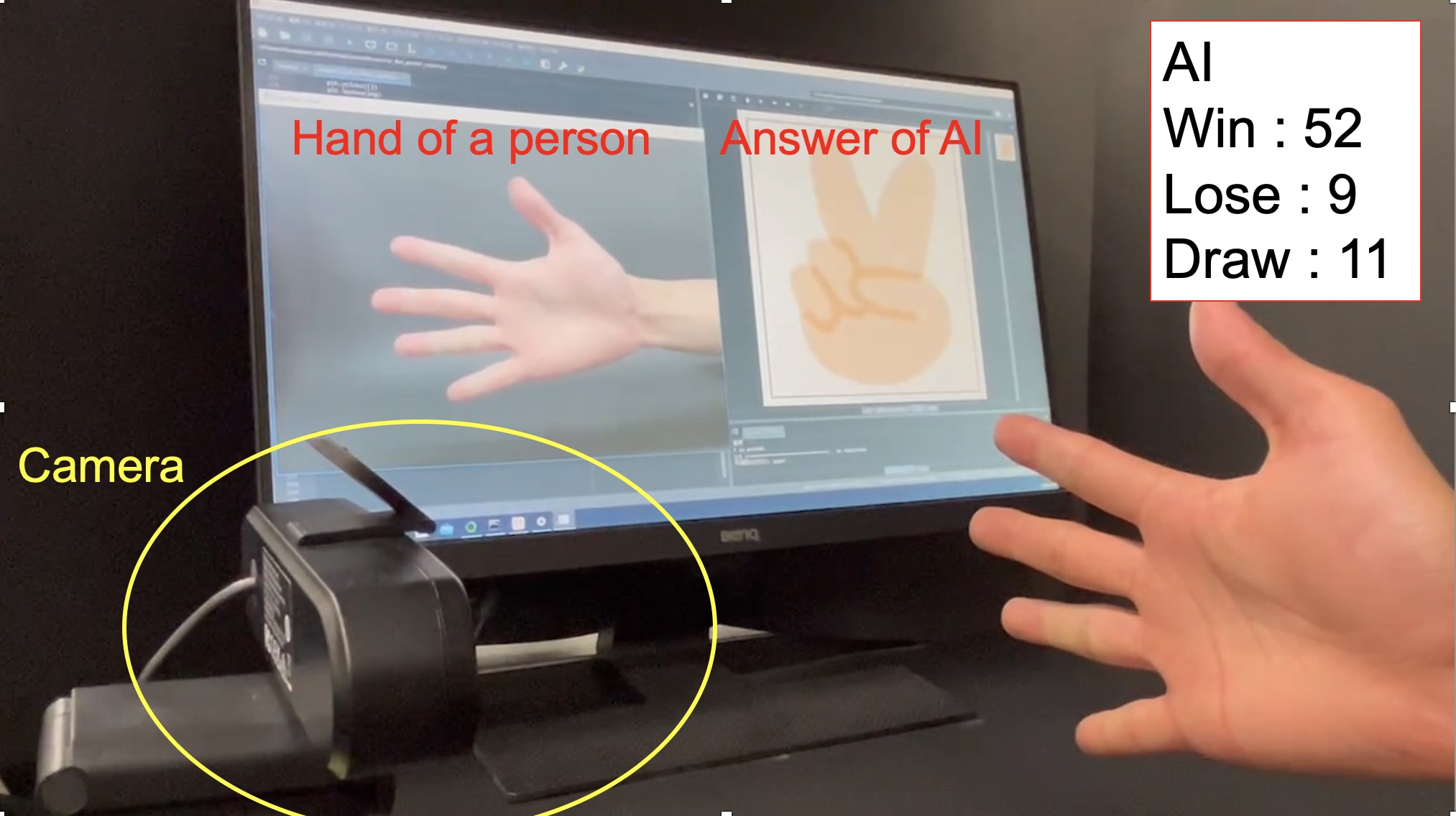 カメラで撮影した手の画像を処理することで、人間とAIがジャンケンをするシステムを開発しました。後だしジャンケンではありますが、勝率は7割を超えています。Jpn. J. Appl. Phys. 63, SG1032 (2024)で発表。
